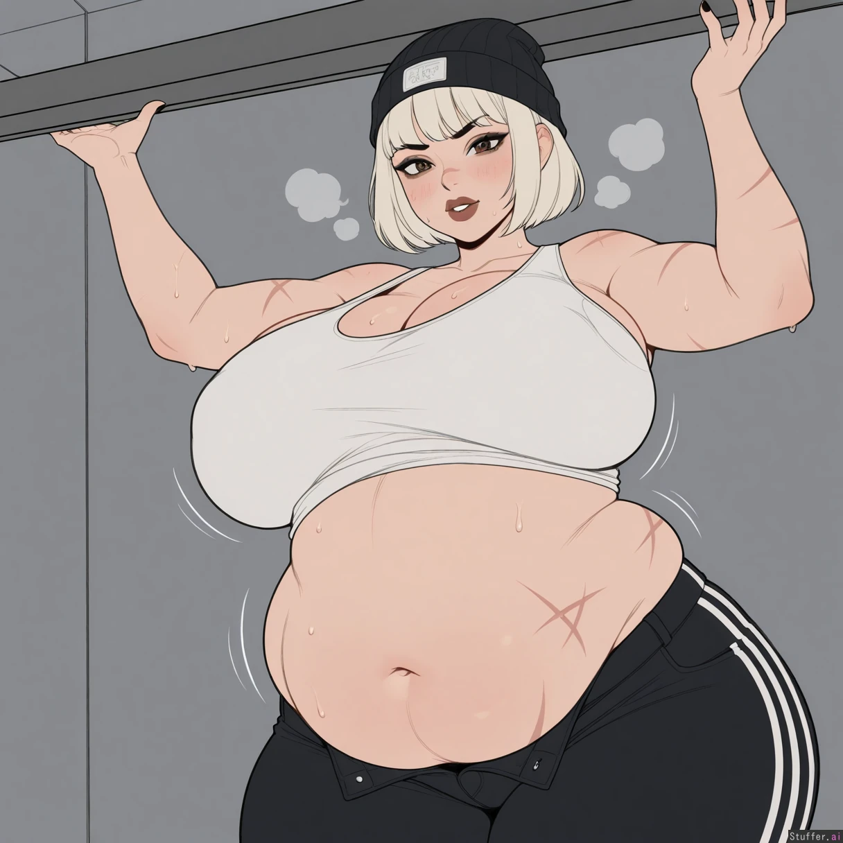KAMII MOMORU(artist), kipteitei(artist), ((Flat color, simple shading)), (cold_lighting), motion lines jiggle (Short platinum blonde bob cut hair, light skin, brown lipstick, dark eyeshadow, scars on body, white_nail_polish, goldem brown eyes) (gym outfit, (tight white tank top belly hanging out, deep navel), black beanie, tight black dress pants, outgrown clothes, pants unbuttoned, too fat for clothes) (Curvy, getting fat, busty), fat soft thighs, (plump hips), (Perfect 2d art)), (((gigantic huge_full_belly))), painfully_full, heavy belly, round belly, belly filled to the brim with food ((tired expression, (beautiful detailed face)), (lifting two small dumbells, sweating, heavy breathing, furrowed eyebrows)