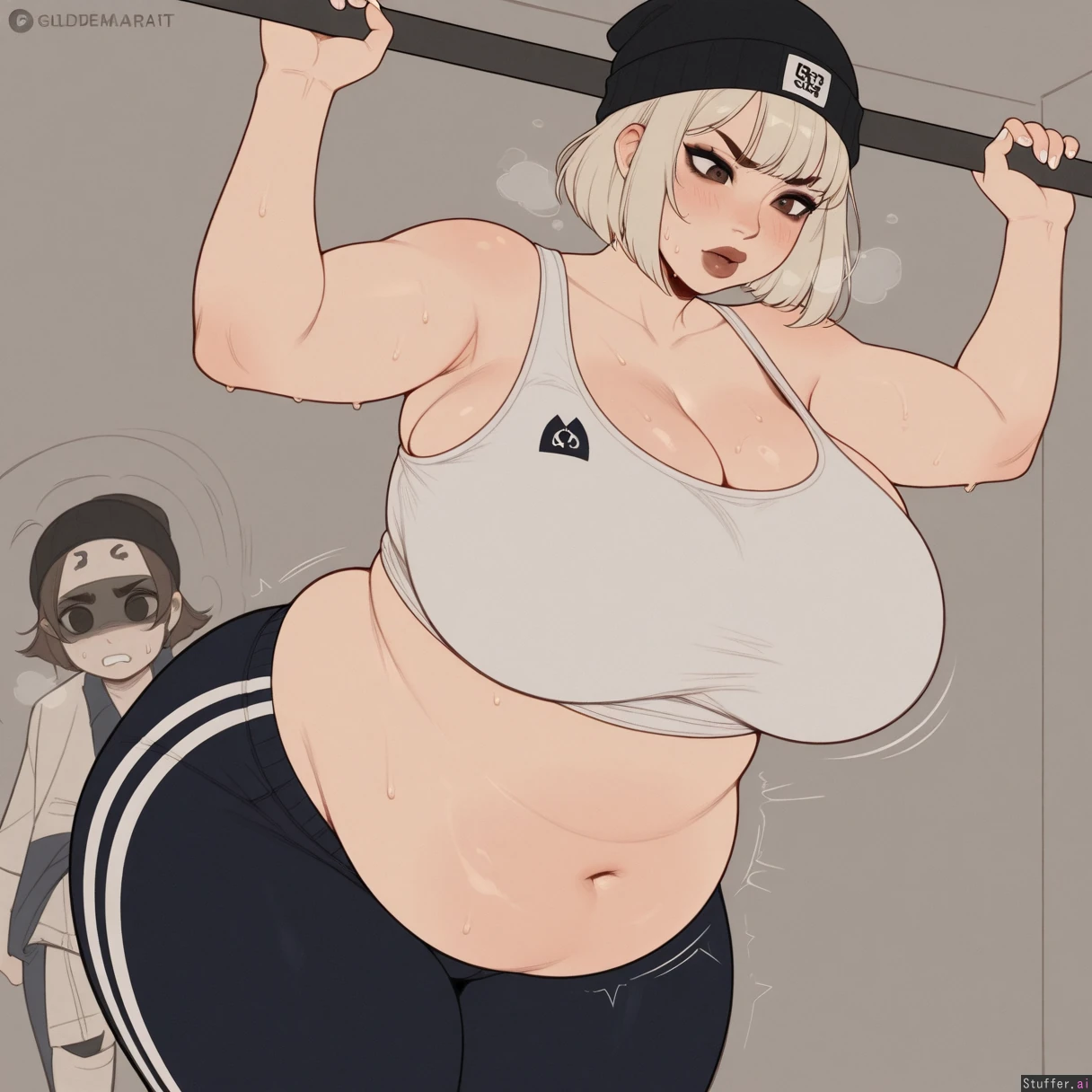 KAMII MOMORU(artist), kipteitei(artist), ((Flat color, simple shading)), (cold_lighting), motion lines jiggle (Short platinum blonde bob cut hair, light skin, brown lipstick, dark eyeshadow, white_nail_polish, goldem brown eyes) (gym outfit, (tight white tank top belly hanging out, deep navel), black beanie, tight black dress pants, outgrown clothes, pants unbuttoned, too fat for clothes) (Curvy, getting fat, busty), fat soft thighs, (plump hips), (Perfect 2d art)), (((gigantic huge_full_belly))), painfully_full, heavy belly, round belly, belly filled to the brim with food, overfed belly ((tired expression, (beautiful detailed face)), (lifting two small dumbells, sweating, heavy breathing, furrowed eyebrows)