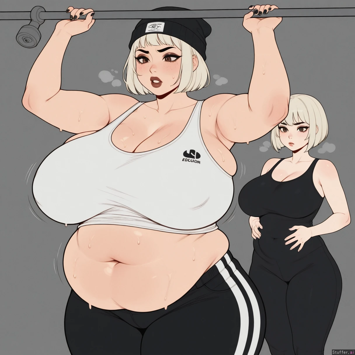 KAMII MOMORU(artist), kipteitei(artist), ((Flat color, simple shading)), (cold_lighting), motion lines jiggle (Short platinum blonde bob cut hair, light skin, brown lipstick, dark eyeshadow, white_nail_polish, goldem brown eyes) (gym outfit, (tight white tank top belly hanging out, deep navel), black beanie, tight black dress pants, outgrown clothes, pants unbuttoned, too fat for clothes) (Curvy, getting fat, busty), fat soft thighs, (plump hips), (Perfect 2d art)), (((gigantic huge_full_belly))), painfully_full, heavy belly, round belly, belly filled to the brim with food, overfed belly ((tired expression, (beautiful detailed face)), (lifting two small dumbells, sweating, heavy breathing, furrowed eyebrows)
