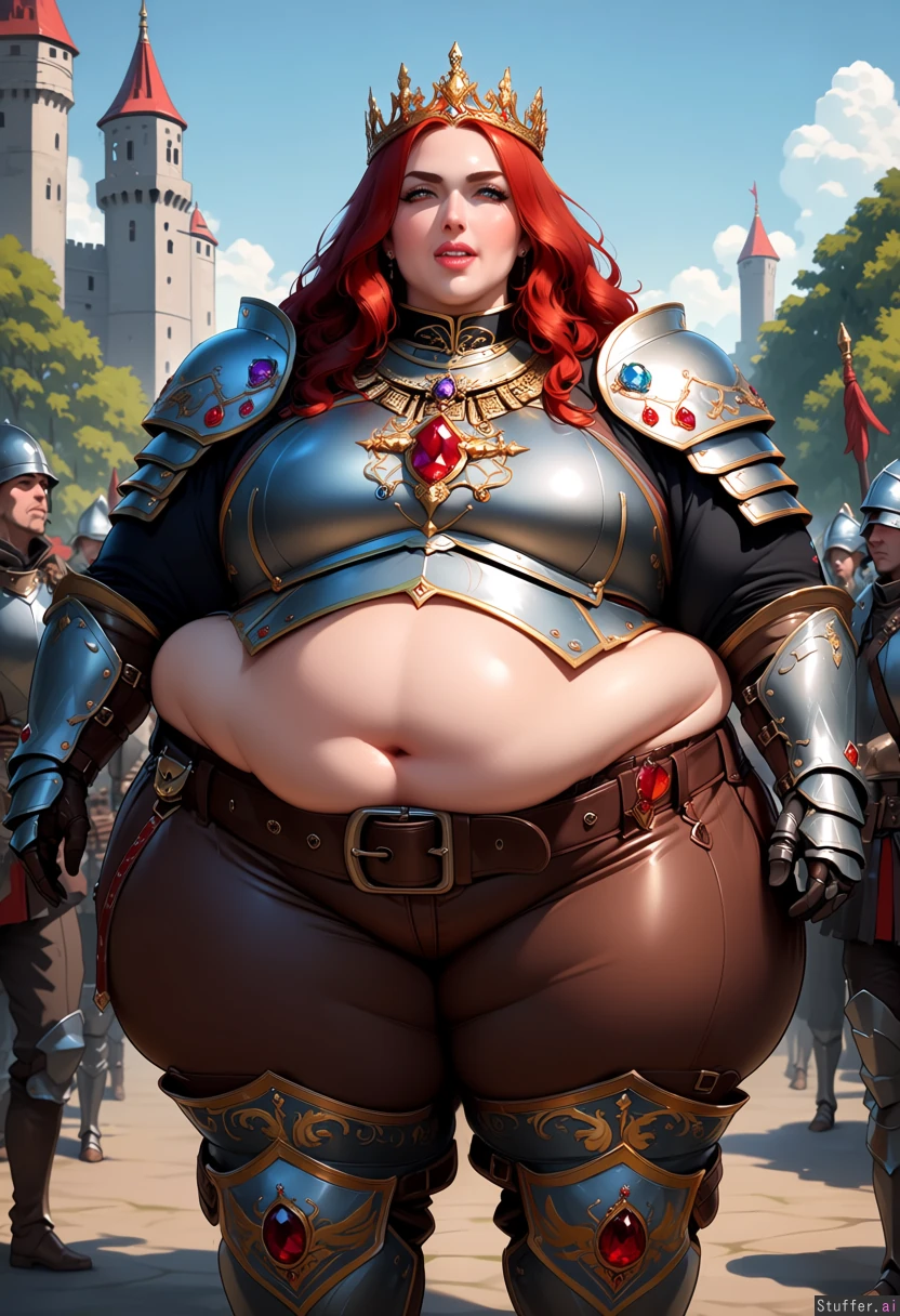fantasy realism. outdoors, in front of castle. tall confident warrior. Her ornate metal armor is lined with precious gems but is too small and covers only her arms and upper chest. bottom half of large fat belly and fat rolls exposed. she wears baggy leather pants with royal patterns under plated armor on her knees and legs. large belt. tight straps squeeze her fat thighs. rare gems embedded into armor. ornate necklace. gorgeous face, long red hair, low golden crown. very fat. beautiful teeth. out of shape, gained weight. eating a turkey leg. escorted by skinny royal guards. In background a Commoners looks on with interest.