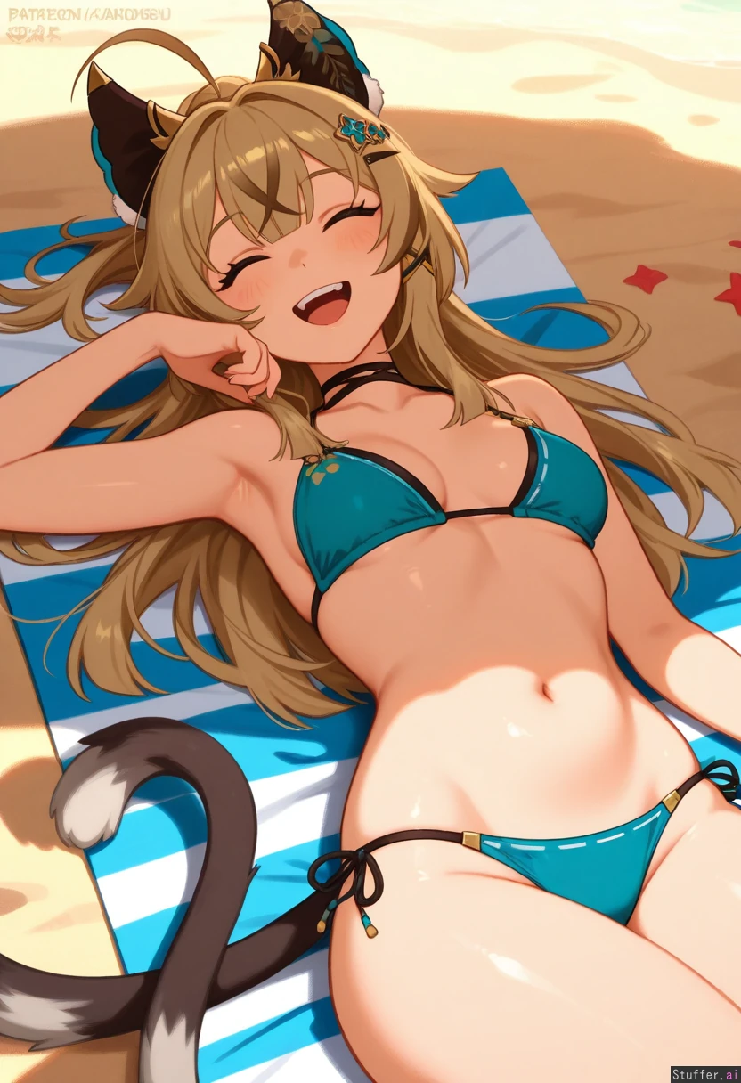 kirara_(genshin_impact),best quality , smooth skin ,(khyle(artist):0.6) , (masterpiece), (gardegu /(artist/):1.1), (blushyspicy(artist):0.7) , (usa37107692:0.5) ,1girl, solo, bikini, beach , (small_breasts), petite,laying_on_belly, relaxing , open_mouth , smile