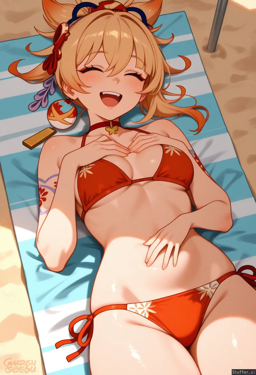 yoimiya_(genshin_impact),best quality , smooth skin ,(khyle(artist):0.6) , (masterpiece), (gardegu /(artist/):1.1), (blushyspicy(artist):0.7) , (usa37107692:0.5) ,1girl, solo, bikini, beach , (small_breasts), petite,laying_on_belly, relaxing , open_mouth , smile, hands_on_own_chest