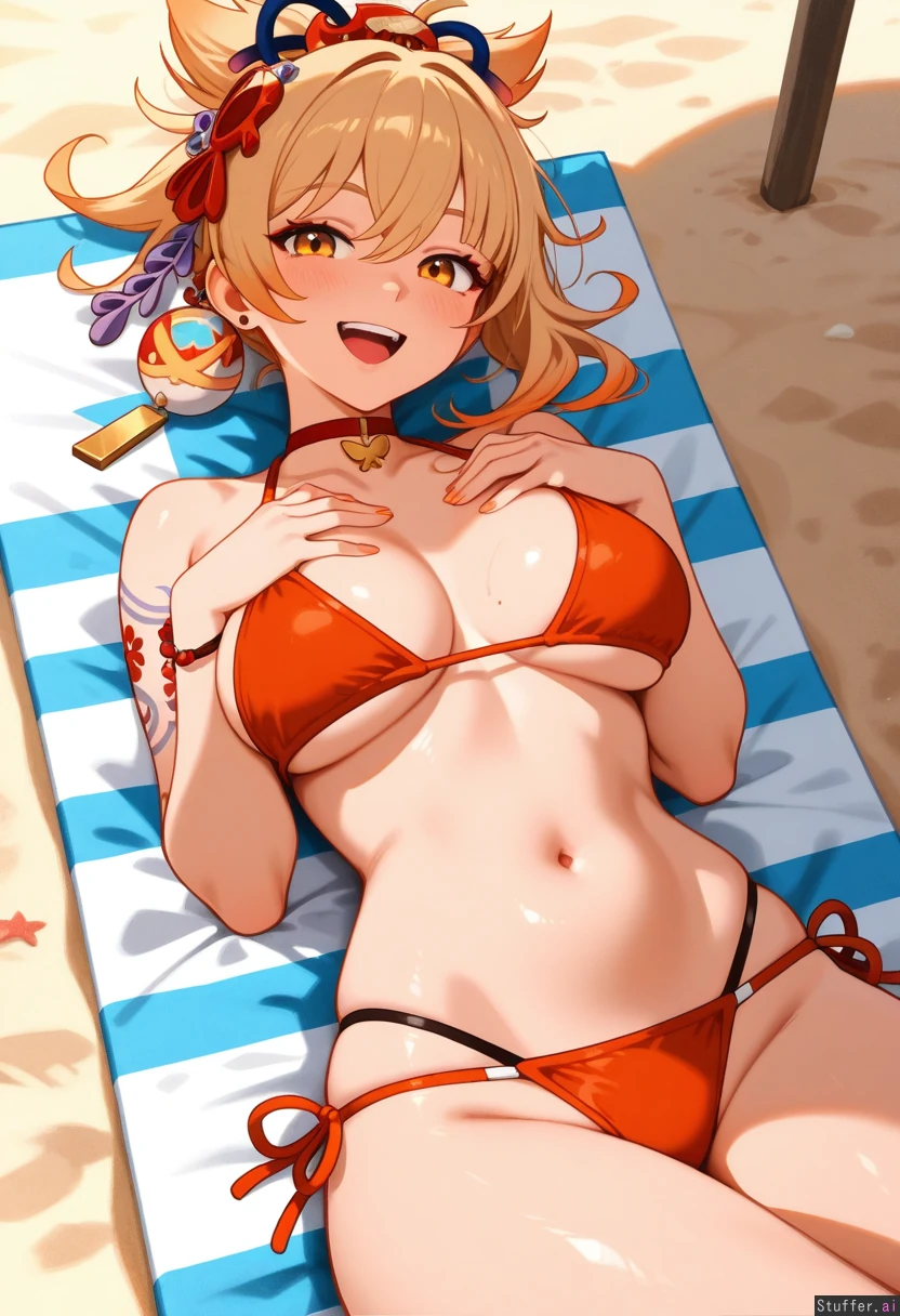 yoimiya_(genshin_impact),best quality , smooth skin ,(khyle(artist):0.6) , (masterpiece), (gardegu /(artist/):1.1), (blushyspicy(artist):0.7) , (usa37107692:0.5) ,1girl, solo, bikini, beach , (medium_breasts), petite,laying_on_belly, relaxing , open_mouth , smile, hands_on_own_chest