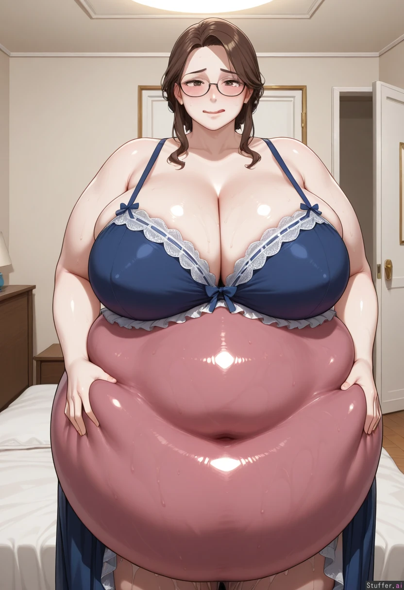 (woman), (big), (pale skin), (very tall), (mature), (short brown hair), (frilly lingerie), (bedroom), (chubby), (chubby arms), (glasses), (massive breasts), (thick), (large belly), (gigantic belly), (enormous belly), (big round belly:1.4), (vore belly:1.5), (pale belly), (embarrassed), (blushing), (sweaty), (hungry), (licking lips)