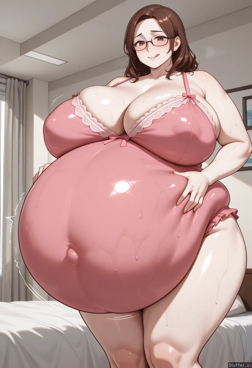 (woman), (big), (pale skin), (very tall), (mature), (short brown hair), (frilly lingerie), (bedroom), (chubby), (chubby arms), (glasses), (massive breasts), (thick), (large belly), (gigantic belly), (enormous belly), (big round belly:1.4), (vore belly:1.5), (pale belly), (embarrassed), (blushing), (sweaty), (hungry), (licking lips)