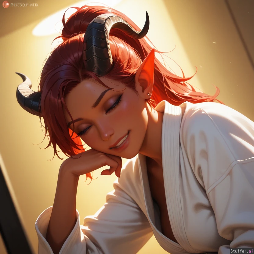 (((Ultra HD), (perfect lighting), photorealistic), HDR, best quality, masterpiece, hyper detailed, detailed face)), (bust), (sexy:1.2), 1woman, ponytail, (tiefling), white karate gi ((yellow background)) (fierce:1.4) (dominant:0.2) (mischievous:0.2) (exhausted:0.2) (asleep:0.2) (excited:0.2) (giggling:0.2) (blushing:0.2) (orgasming:0.2)