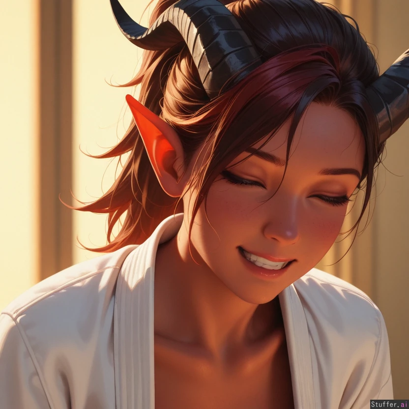 (((Ultra HD), (perfect lighting), photorealistic), HDR, best quality, masterpiece, hyper detailed, detailed face)), (bust), (sexy:1.2), 1woman, ponytail, (tiefling), white karate gi ((yellow background)) (fierce:1.4) (dominant:0.2) (mischievous:0.2) (exhausted:0.2) (asleep:0.2) (excited:0.2) (giggling:0.2) (blushing:0.2) (orgasming:0.2)