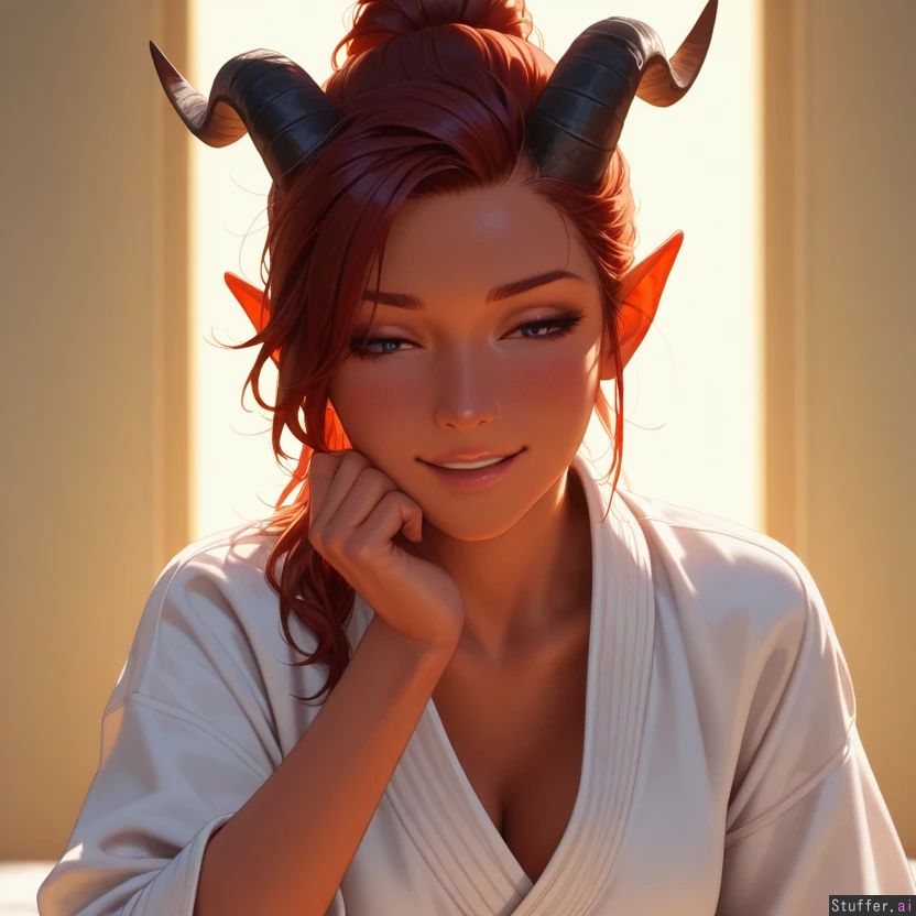 (((Ultra HD), (perfect lighting), photorealistic), HDR, best quality, masterpiece, hyper detailed, detailed face)), (bust), (sexy:1.2), 1woman, ponytail, (tiefling), white karate gi ((yellow background)) (fierce:1.4) (dominant:0.2) (mischievous:0.2) (exhausted:0.2) (asleep:0.2) (excited:0.2) (giggling:0.2) (blushing:0.2) (orgasming:0.2)