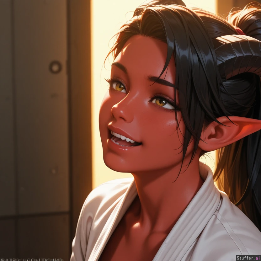 (((Ultra HD), (perfect lighting), photorealistic), HDR, best quality, masterpiece, hyper detailed, detailed face)), (bust), (sexy:1.2), 1woman, ponytail, (tiefling), white karate gi ((yellow background)) (fierce:1.4) (dominant:0.2) (mischievous:0.2) (exhausted:0.2) (asleep:0.2) (excited:0.2) (giggling:0.2) (blushing:0.2) (orgasming:0.2) (distressed:0.2) (panicking:0.2)