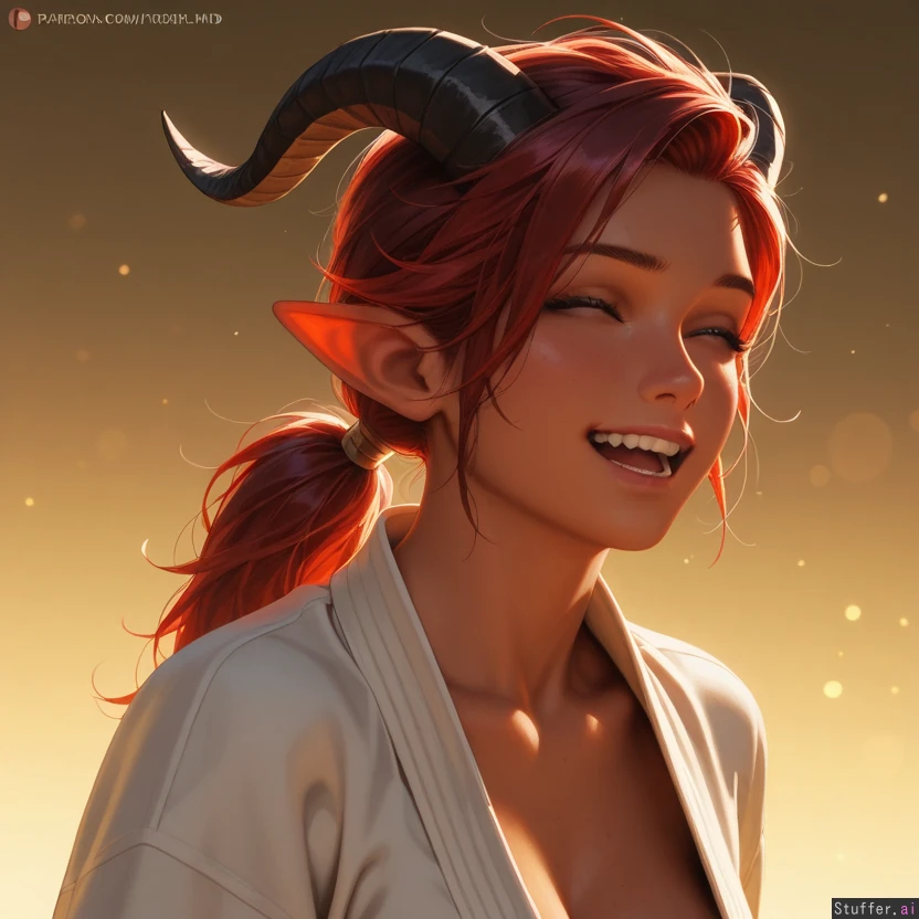 (((Ultra HD), (perfect lighting), photorealistic), HDR, best quality, masterpiece, hyper detailed, detailed face)), (bust), (sexy:1.2), 1woman, ponytail, (tiefling), white karate gi ((yellow background)) (fierce:1.4) (dominant:0.2) (mischievous:0.2) (exhausted:0.2) (asleep:0.2) (excited:0.2) (giggling:0.2) (blushing:0.2) (orgasming:0.2) (distressed:0.2) (panicking:0.2)