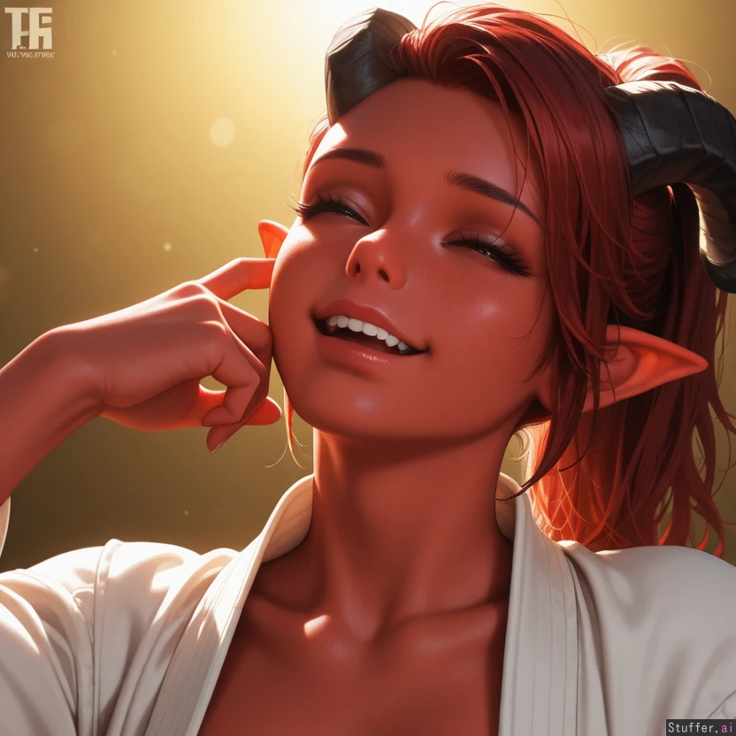 (((Ultra HD), (perfect lighting), photorealistic), HDR, best quality, masterpiece, hyper detailed, detailed face)), (bust), (sexy:1.2), 1woman, ponytail, ((tiefling)), white karate gi ((yellow background)) (fierce:1.4) (dominant:0.2) (mischievous:0.2) (exhausted:0.2) (asleep:0.2) (excited:0.2) (giggling:0.2) (blushing:0.2) (orgasming:0.2) (distressed:0.2) (panicking:0.2)