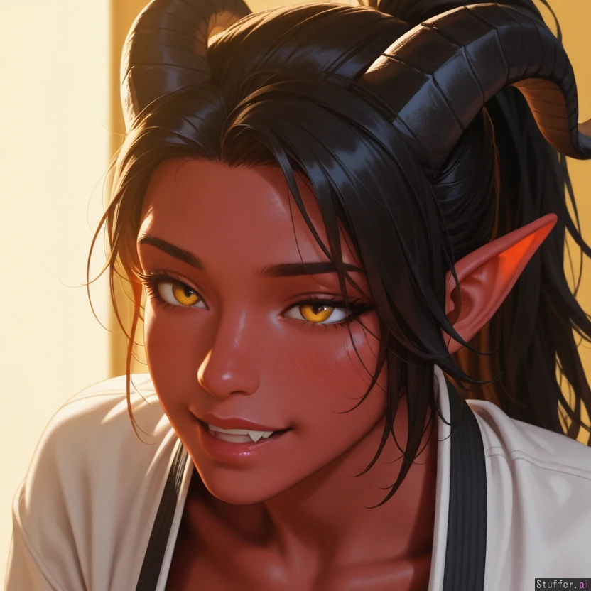 (((Ultra HD), (perfect lighting), photorealistic), HDR, best quality, masterpiece, hyper detailed, detailed face)), (bust), (sexy:1.2), 1woman, ponytail, ((tiefling)), white karate gi ((yellow background)) (fierce:1.4) (dominant:0.2) (mischievous:0.2) (exhausted:0.2) (asleep:0.2) (excited:0.2) (giggling:0.2) (blushing:0.2) (orgasm:0.2) (distressed:0.2) (panicking:0.2)