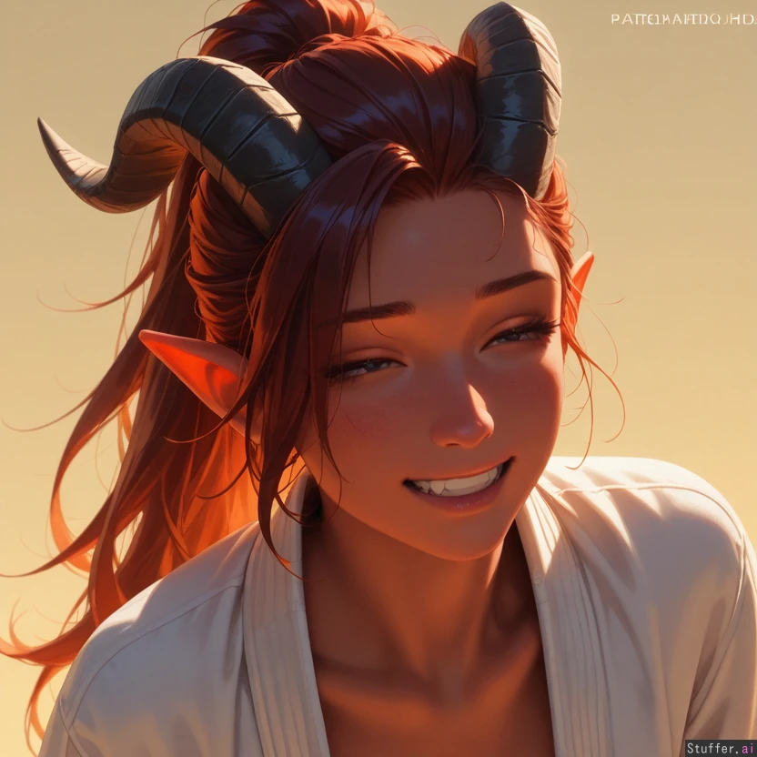 (((Ultra HD), (perfect lighting), photorealistic), HDR, best quality, masterpiece, hyper detailed, detailed face)), ((bust)), (sexy:1.2), 1woman, ponytail, ((tiefling)), white karate gi ((yellow background)) (fierce:1.4) (dominant:0.2) (mischievous:0.2) (exhausted:0.2) (asleep:0.2) (excited:0.2) (giggling:0.2) (blushing:0.2) (orgasm:0.2) (distressed:0.2) (panicking:0.2)