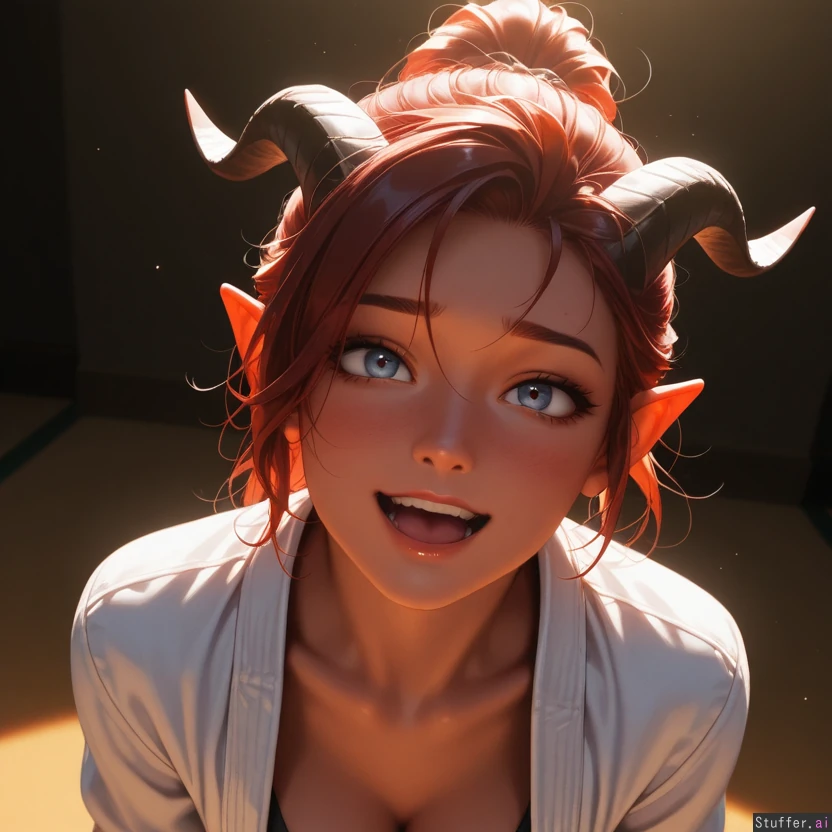 (((Ultra HD), (perfect lighting), photorealistic), HDR, best quality, masterpiece, hyper detailed, detailed face)), ((bust)), (sexy:1.2), 1woman, ponytail, ((tiefling)), white karate gi ((yellow background)) (fierce:1.4) (dominant:0.2) (mischievous:0.2) (exhausted:0.2) (asleep:0.2) (excited:0.2) (giggling:0.2) (blushing:0.2) (orgasm:0.2) (distressed:0.2) (panicking:0.2)