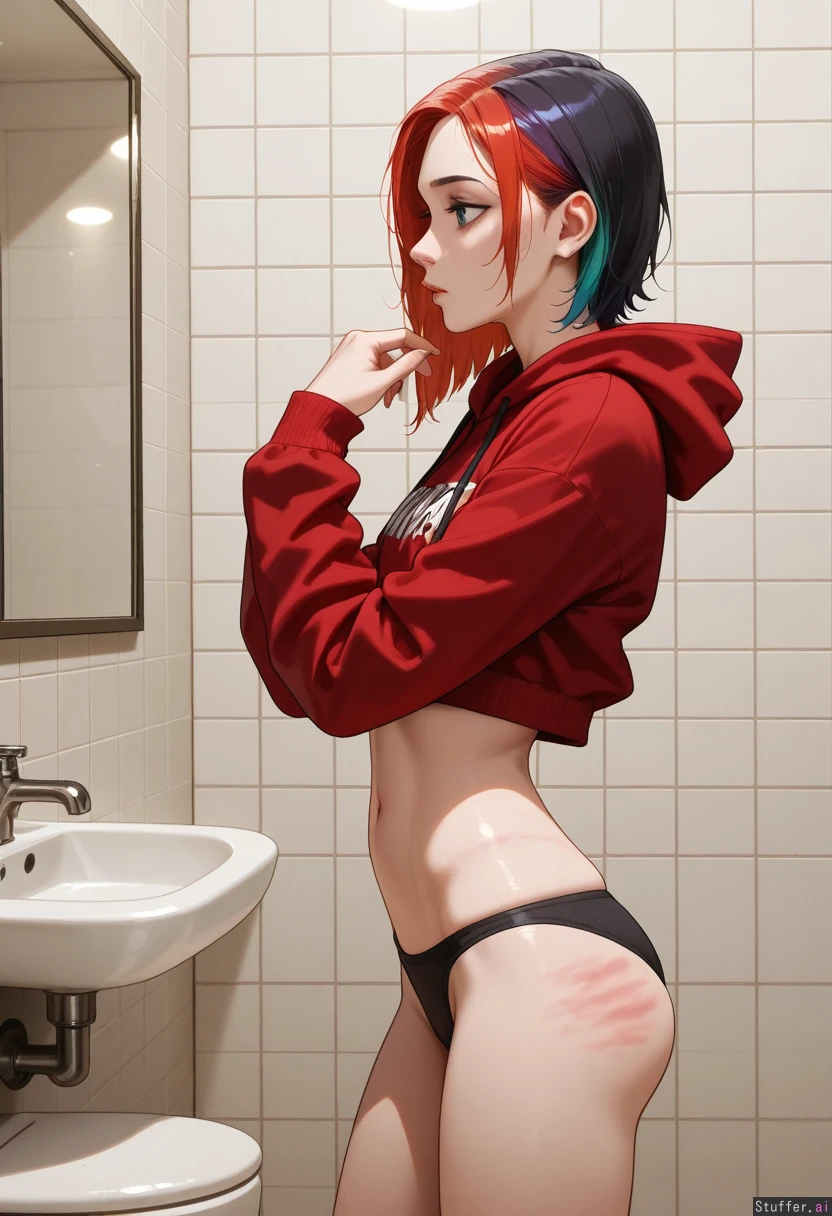 Solo, 1girl, blue eyes, rainbow_hair, black panties, red hoodie crop, nose nose_piercing,(skinny, narrow waist), mature, bathroom, (growth marks on body), emo, nonchalant, side view