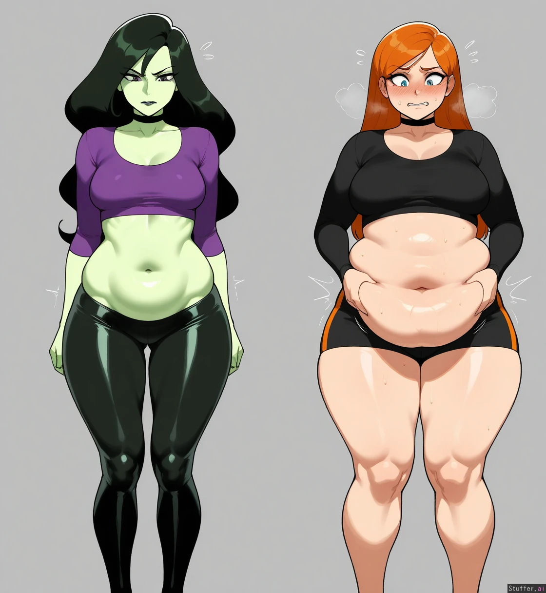 masterpiece, amazing resolution , nyantcha(artist), krekkov (artist), dramatic lighting, 8k, uhd 2 women, Kim possible caucasian skin, shego green skin, ((Kim possible Caucasian skin ginger hair)), ((weight gain:1.35)), ((fat legs:1.35)),((flustered)), ((chubby belly:1.35), ((shego athletic skinny no fat is squeezing Kim possible belly from behind)), (1flatchest adult)