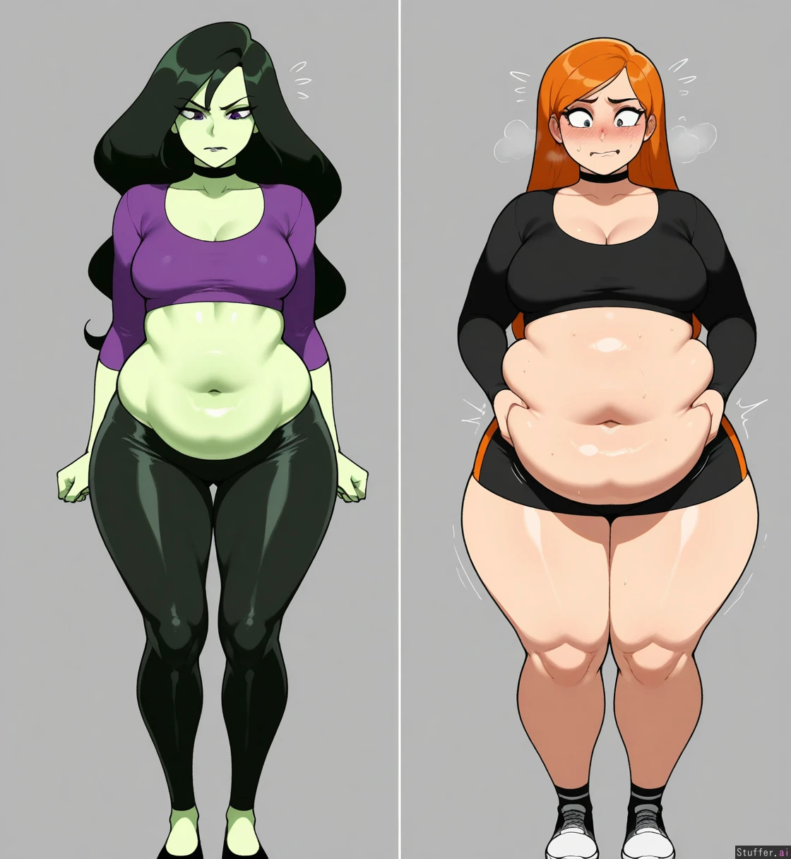 masterpiece, amazing resolution , nyantcha(artist), krekkov (artist), dramatic lighting, 8k, uhd 2 women, Kim possible caucasian skin, shego green skin, ((Kim possible Caucasian skin ginger hair)), ((weight gain:1.43)), ((fat legs:1.43)),((flustered)), ((chubby belly:1.43), ((shego athletic skinny no fat is squeezing Kim possible belly from behind)), (1flatchest adult)
