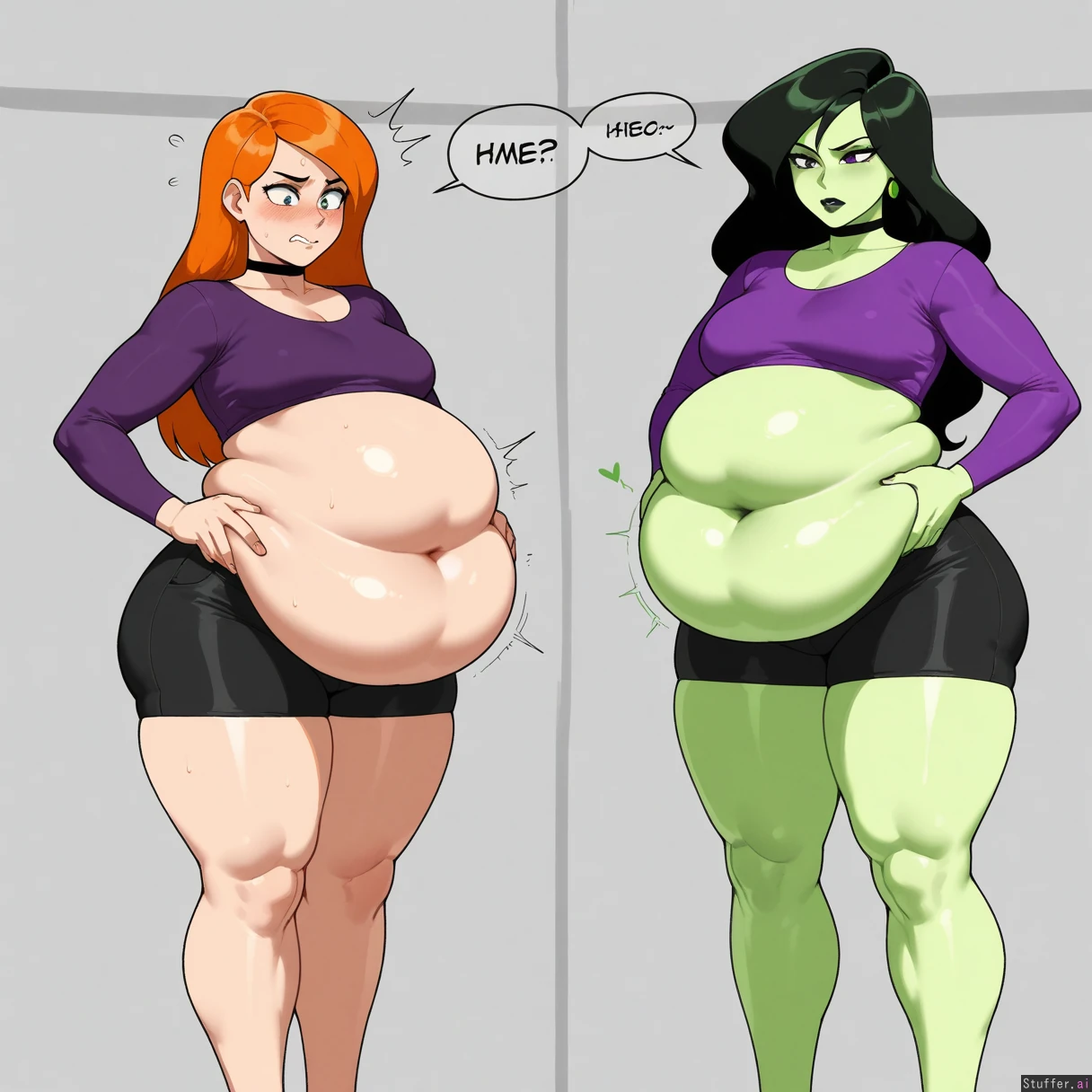 masterpiece, amazing resolution , nyantcha(artist), krekkov (artist), dramatic lighting, 8k, uhd 2 women, Kim possible caucasian skin, shego green skin, ((Kim possible Caucasian skin ginger hair)), ((weight gain:1.45)), ((fat legs:1.45)),((flustered)), ((chubby belly:1.45), ((shego athletic skinny no fat is squeezing Kim possible belly)), (1flatchest adult)