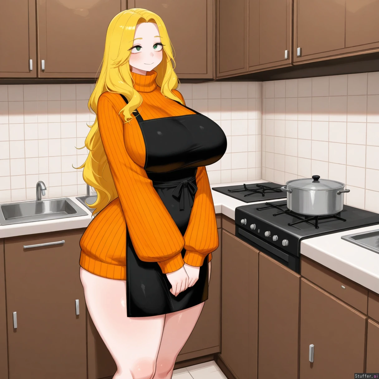**base** absurdres, best_shading warm_lighting, best_quality, masterpiece, solo, high_resolution, high_rating **artist** RockSolidArt(artist), (usa37107692:1.2), (ohasi_art), (betterwithsalt), (pixiveo) **character** Miyako_Ishida(voice_form) , (42 years old) mature_milf, mommy, house_wife, green_eyes, blonde_hair **clothes** Orange_sweater_dress, black_apron **settings** Kitchen, standing **body** (Tall:1.4), long_legs ((Wide_hips), (gigantic_breasts), (gigantic_ass), (gigantic_thighs), (morbidly_obese_female), (love_handls), (Gigantic_belly), (extra hyper fat) (Fat_arms:0.85), (fat_legs), :0.1),