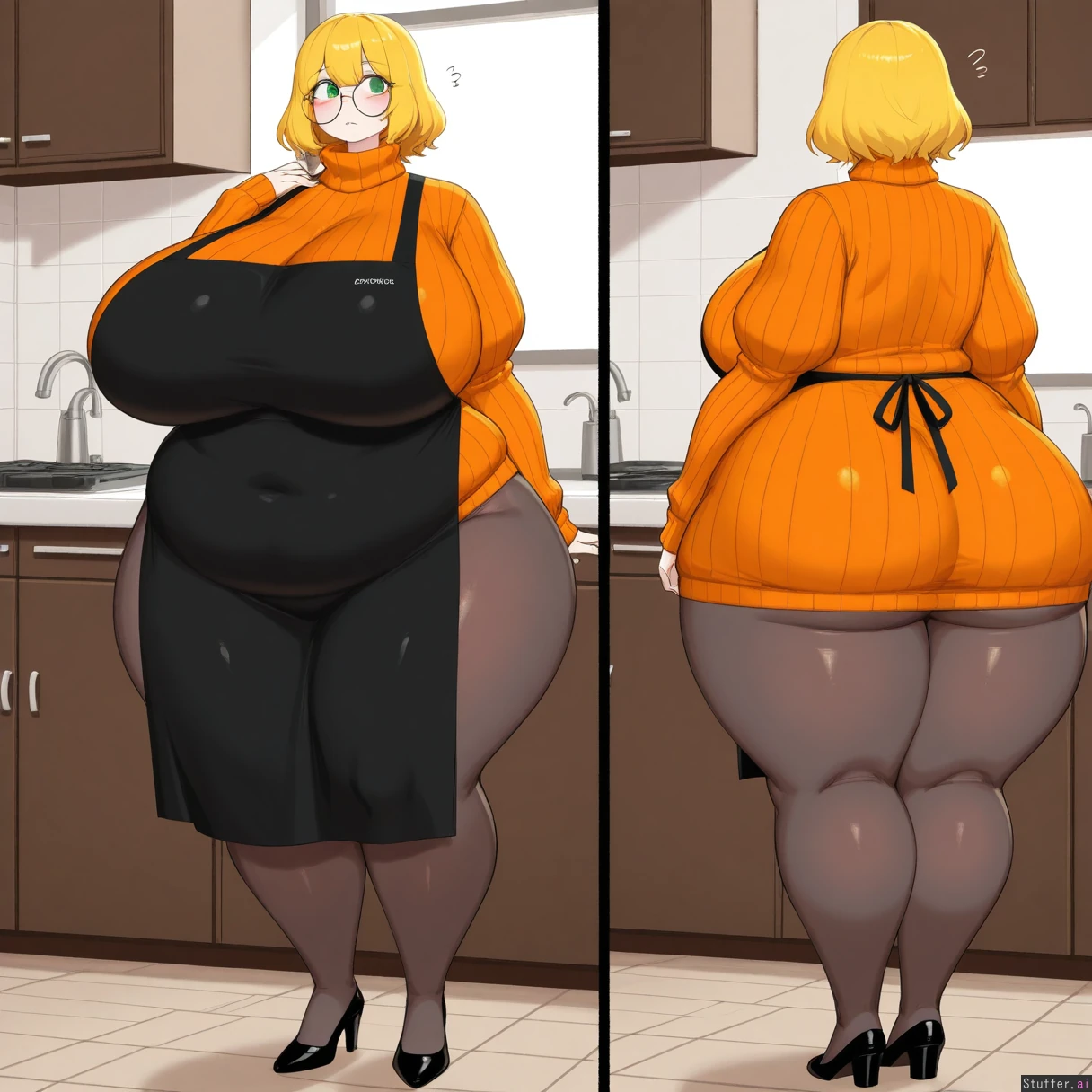 **base** absurdres, best_shading warm_lighting, best_quality, masterpiece, solo, high_resolution, high_rating **artist** RockSolidArt(artist), (usa37107692:1.2), (ohasi_art), (betterwithsalt), (pixiveo) **character** (((Miyako_Ishida(voice_form))), (42 years old) mature_milf, mommy, house_wife, green_eyes, blonde_hair **clothes** Orange_sweater_dress, black_apron **settings** Kitchen, standing **body** (Tall:1.4), long_legs ((Wide_hips), (gigantic_breasts), (gigantic_ass), (gigantic_thighs), (morbidly_obese_female), (love_handls), (Gigantic_belly), (extra hyper fat) (Fat_arms:0.85), (fat_legs), :0.1),