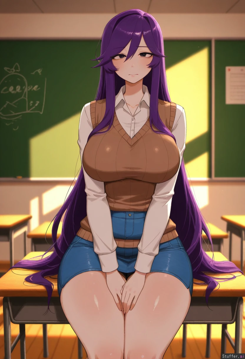 **base** absurdres, best_shading warm_lighting, best_quality, masterpiece, solo, high_resolution, high_rating **artist** RockSolidArt(artist), (usa37107692:1.2), (ohasi_art), (betterwithsalt), (pixiveo) **character** yuri_(doki_doki_literature_club) , (42 years old), mature_milf, purple_hair **clothes** School_outfit **settings** School, classroom **body** (Tall:1.4), long_legs ((Wide_hips), (gigantic_breasts), (gigantic_ass), (gigantic_thighs), (morbidly_obese_female), (love_handls), (Fat_arms:0.85), (fat_legs), :0.1), skinny