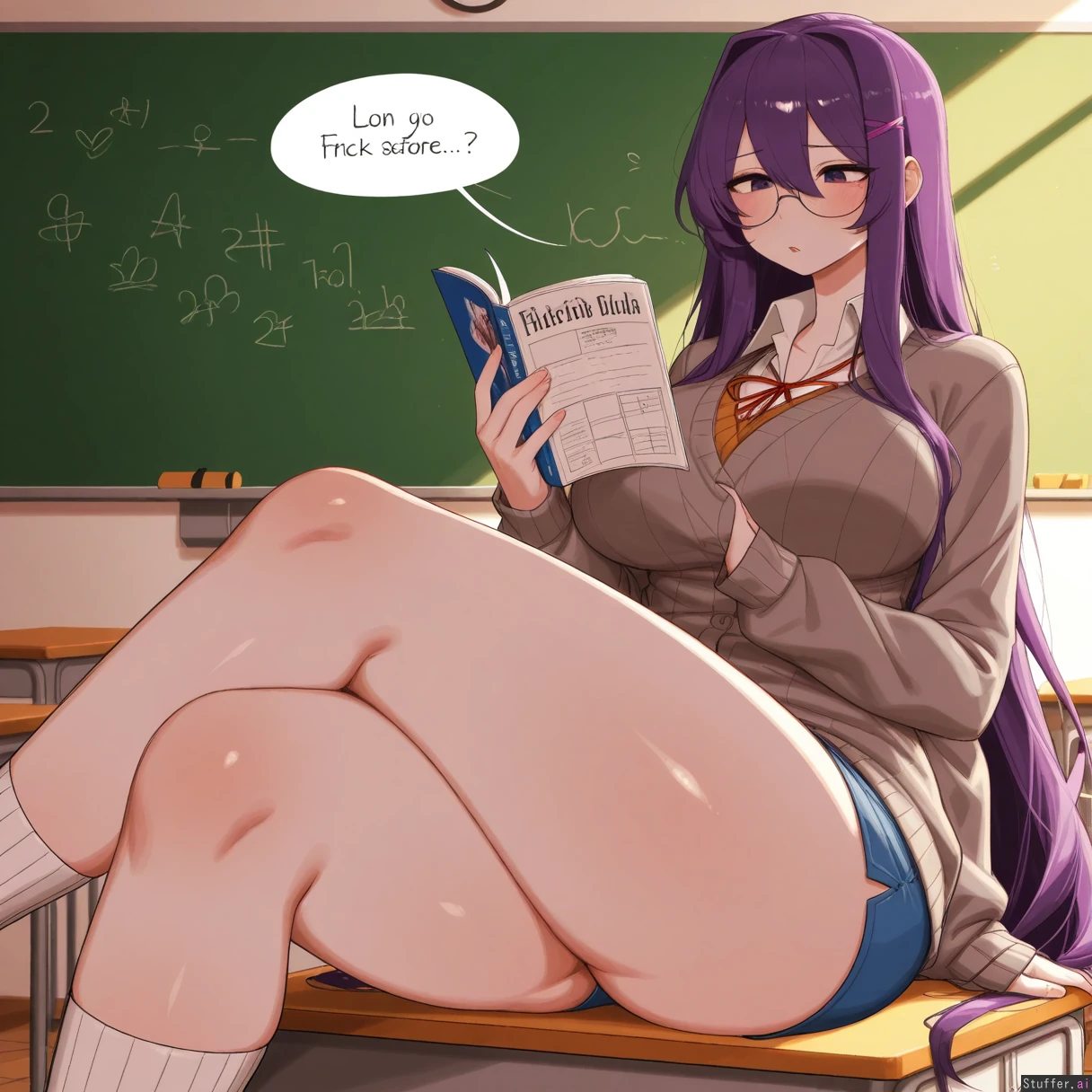 **base** absurdres, best_shading warm_lighting, best_quality, masterpiece, solo, high_resolution, high_rating **artist** RockSolidArt(artist), (usa37107692:1.2), (ohasi_art), (betterwithsalt), (pixiveo) **character** ((yuri_(doki_doki_literature_club))) , mature_milf, purple_hair **clothes** School_outfit, blue_scirt, school_jacket, **settings** School, classroom, dominant_female, reading_book, **body** (Tall:1.4), long_legs ((Wide_hips), (gigantic_breasts), (gigantic_ass), (gigantic_thighs), (morbidly_obese_female), (love_handls), (Fat_arms:0.85), (fat_legs), :0.1), skinny