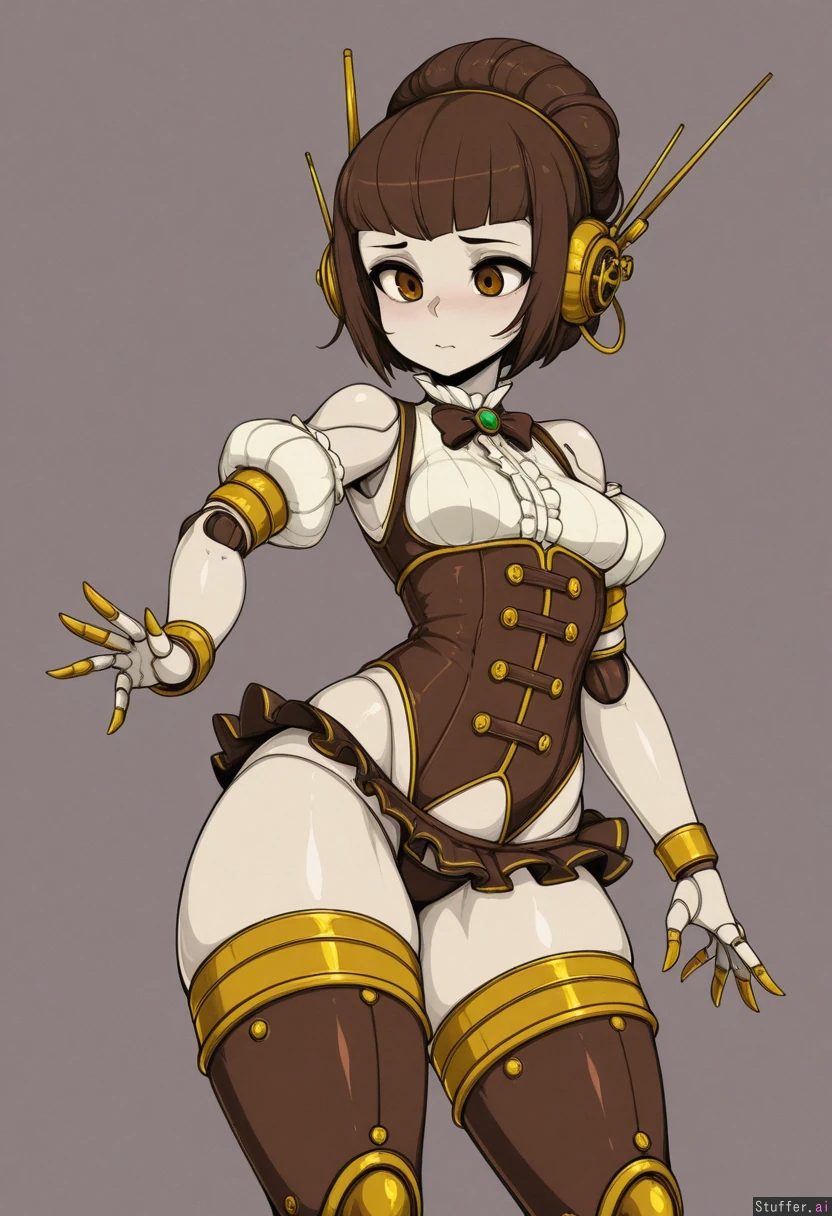 robot_girl, android, robot_ears, robot_joints, doll_joints, mecha_musume, slugbox, mechanical_legs, steampunk, bottomheavy, hips_wider_than_shoulders, thick_thighs, updo, victorian, frills, microskirt, shy, robot_joints, mechanical_parts, blowjob,