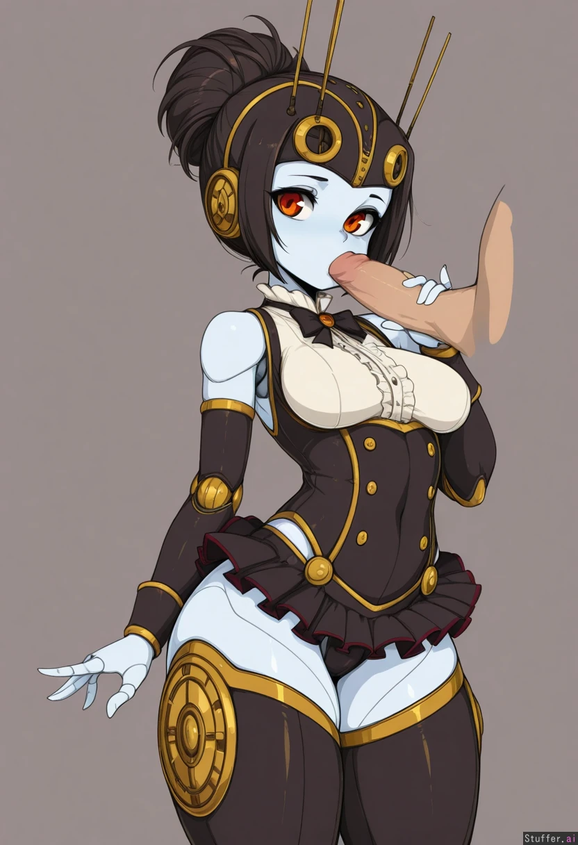 robot_girl, android, robot_ears, robot_joints, doll_joints, mecha_musume, slugbox, mechanical_legs, steampunk, bottomheavy, hips_wider_than_shoulders, thick_thighs, updo, victorian, frills, microskirt, shy, robot_joints, mechanical_parts, blowjob,