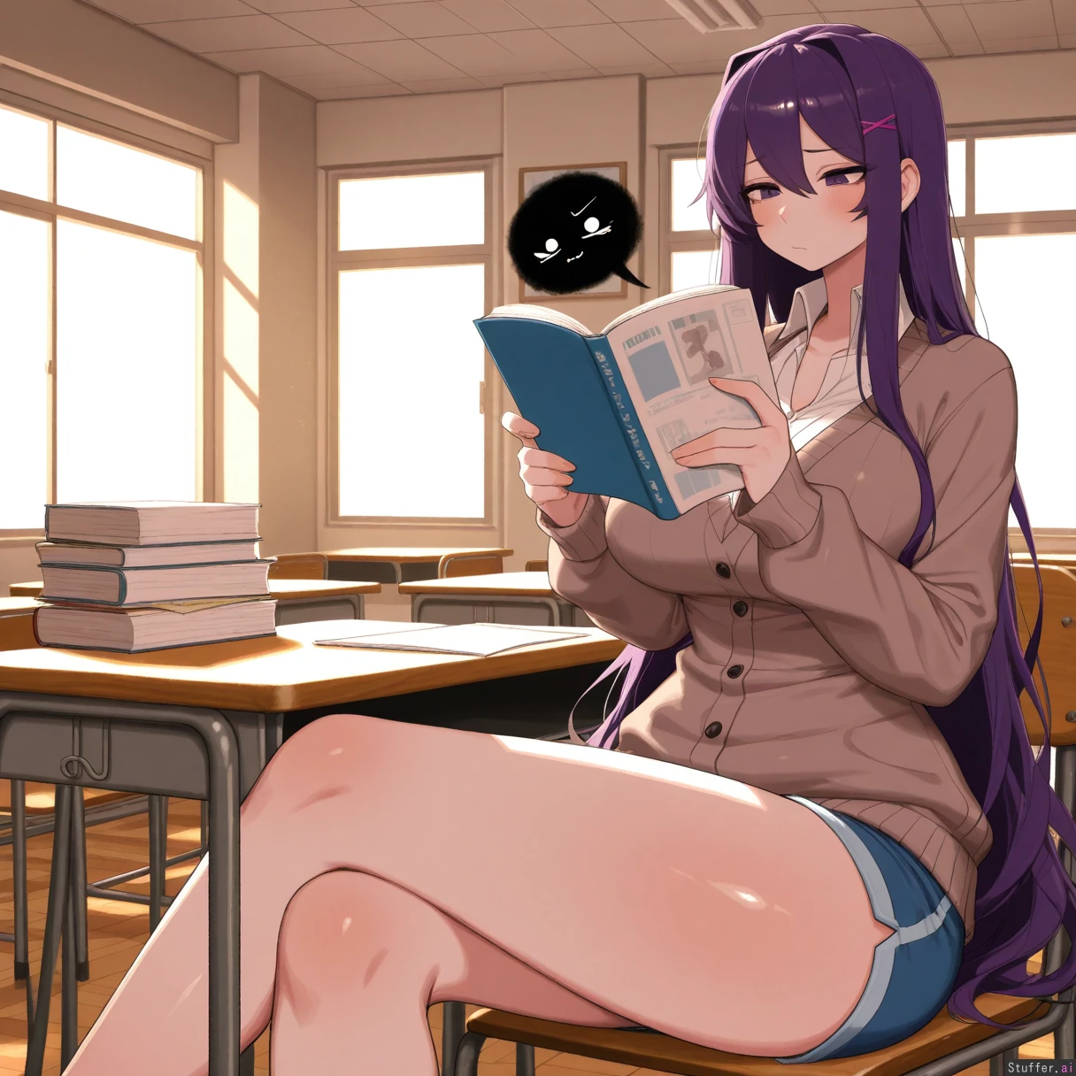 **base** absurdres, best_shading warm_lighting, best_quality, masterpiece, solo, high_resolution, high_rating **artist** RockSolidArt(artist), (usa37107692:1.2), (ohasi_art), (betterwithsalt), (pixiveo) **character** ((yuri_(doki_doki_literature_club))) , mature_milf, purple_hair **clothes** School_outfit, blue_scirt, school_jacket, **settings** School, classroom, dominant_female, reading_book, hot_pose **body** (Tall:1.4), long_legs ((Wide_hips), (gigantic_breasts), (gigantic_ass), (gigantic_thighs), (morbidly_obese_female), (love_handls), (Fat_arms:0.85), (fat_legs), :0.1), skinny