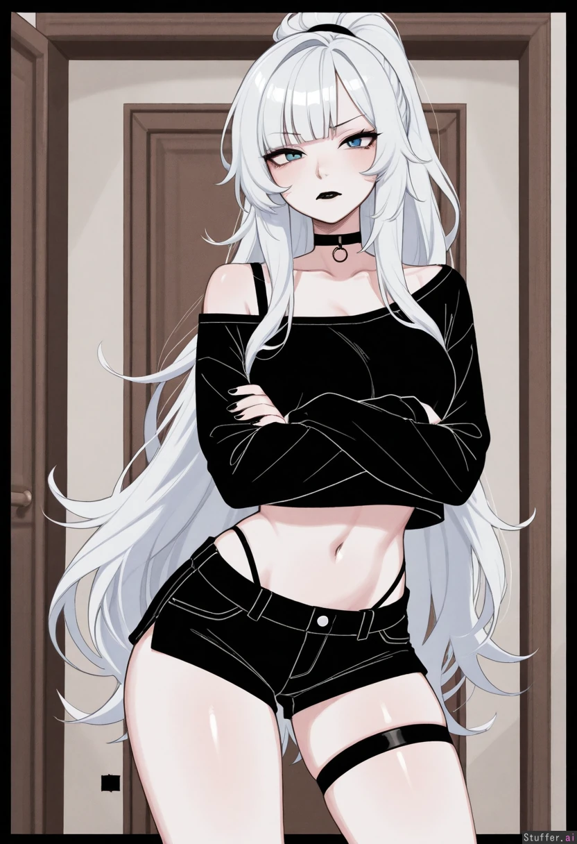 absurdres, 8k, perfect anatomy, masterpiece, beautiful face, beautiful eyes, RockSolidArt. /(artist/), RockSolidArt(artist/) ,8), (merunyaa), (usa37107692:1.2), (ohasi_art), (betterwithsalt), (flat colour:1.5) ((solo)) Bedroom ((White hair, fluffy hair, fluffy ponytail, long hair, bangs, blue eyes, hair hides one eye, pale skin)) Goth, Black lipstick ((Baggy white_crop top, bare shoulder, loose shirt)), black bra, black short shorts, black panty straps, standing, arms crossed