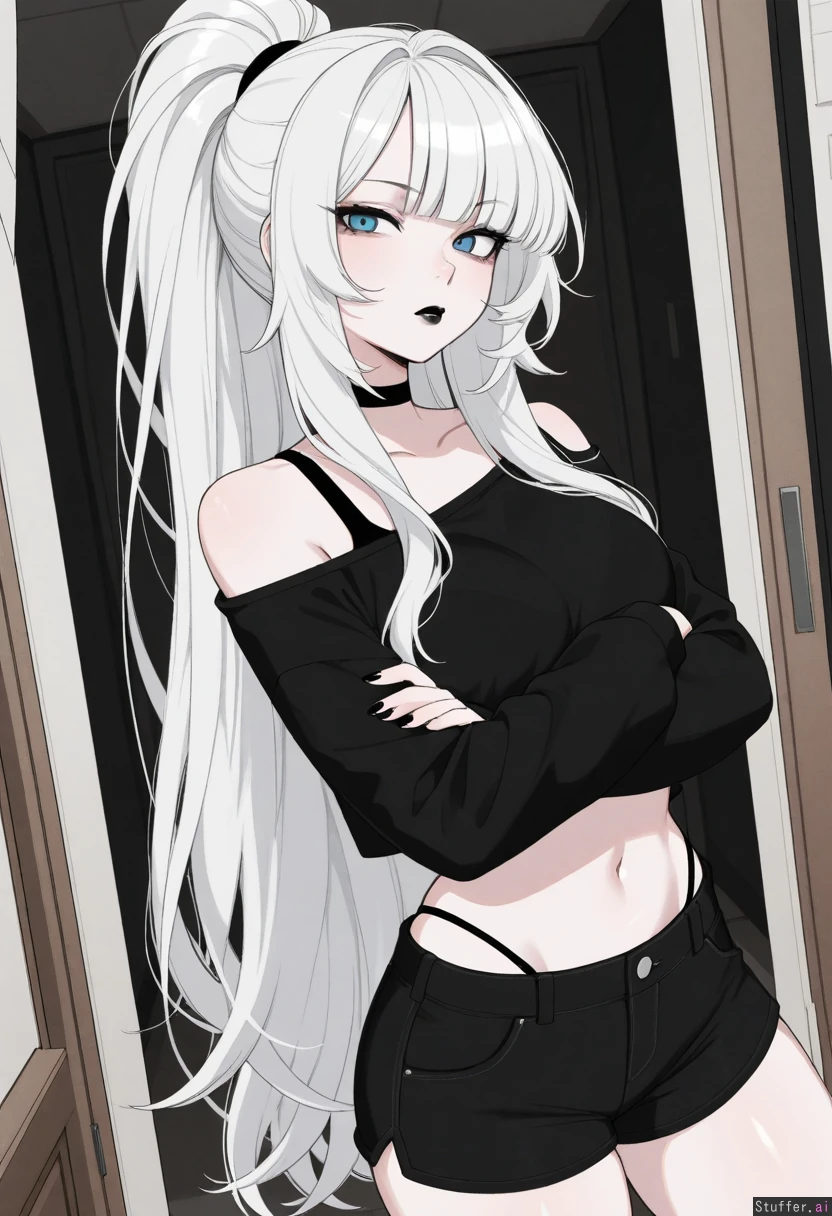 absurdres, 8k, perfect anatomy, masterpiece, beautiful face, beautiful eyes, RockSolidArt. /(artist/), RockSolidArt(artist/) ,8), (merunyaa), (usa37107692:1.2), (ohasi_art), (betterwithsalt), (flat color:1.5) ((solo)) Bedroom ((White hair, fluffy hair, fluffy ponytail, long hair, bangs, blue eyes, hair hides one eye, pale skin)) Goth, Black lipstick ((Baggy black_crop top, bare shoulder, loose shirt)), black bra, black short shorts, black panty straps, standing, arms crossed