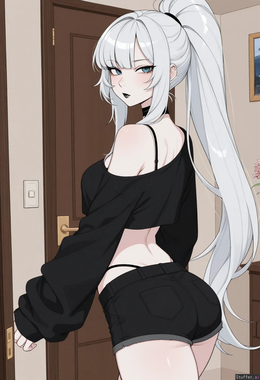 absurdres, 8k, perfect anatomy, masterpiece, beautiful face, beautiful eyes, RockSolidArt. /(artist/), RockSolidArt(artist/) ,8), (merunyaa), (usa37107692:1.2), (ohasi_art), (betterwithsalt), (flat color:1.5) ((solo)) Bedroom ((White hair, fluffy hair, fluffy ponytail, long hair, bangs, blue eyes, hair hides one eye, pale skin)) Goth, Black lipstick ((Baggy black_crop top, bare shoulder, loose shirt)), black bra, black short shorts, black panty straps, walking, backside view, looking at viewer