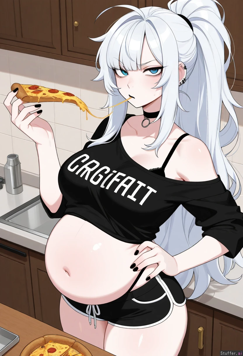 absurdres, 8k, perfect anatomy, masterpiece, beautiful face, beautiful eyes, RockSolidArt. /(artist/), RockSolidArt(artist/) ,8), (merunyaa), (usa37107692:1.2), (ohasi_art), (betterwithsalt), (flat color:1.5) ((solo)) kitchen ((White hair, fluffy hair, fluffy ponytail, long hair, bangs, blue eyes, hair hides one eye, pale skin)) Goth, Black lipstick ((Baggy black_crop top, bare shoulder, loose shirt)), black bra, black short shorts, black panty straps, Eyebrows raised, glaring , Standing, holding pizza slice, chewing, looking at viewer, hand on hip, ((full belly:1.3))