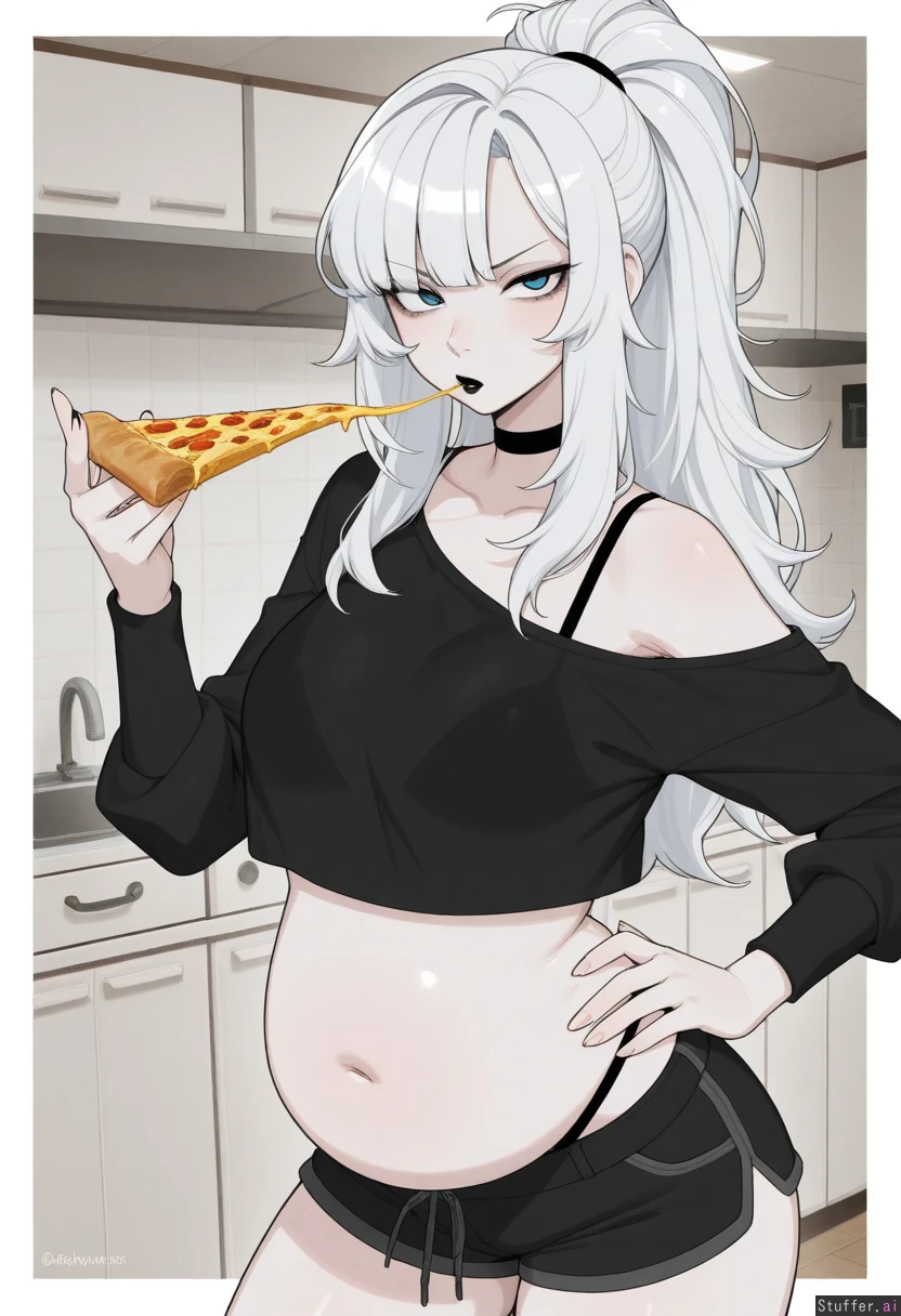 absurdres, 8k, perfect anatomy, masterpiece, beautiful face, beautiful eyes, RockSolidArt. /(artist/), RockSolidArt(artist/) ,8), (merunyaa), (usa37107692:1.2), (ohasi_art), (betterwithsalt), (flat color:1.5) ((solo)) kitchen ((White hair, fluffy hair, fluffy ponytail, long hair, bangs, blue eyes, hair hides one eye, pale skin)) Goth, Black lipstick ((Baggy black_crop top, bare shoulder, loose shirt)), black bra, black short shorts, black panty straps, Eyebrows raised, glaring , Standing, holding pizza slice, chewing, looking at viewer, hand on hip, ((full belly:1.3))