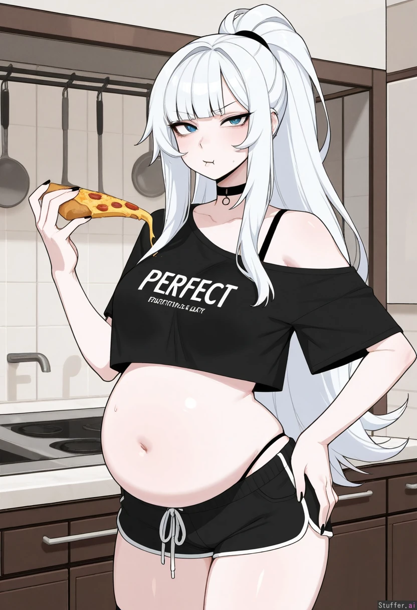 absurdres, 8k, perfect anatomy, masterpiece, beautiful face, beautiful eyes, RockSolidArt. /(artist/), RockSolidArt(artist/) ,8), (merunyaa), (usa37107692:1.2), (ohasi_art), (betterwithsalt), (flat color:1.5) ((solo)) kitchen ((White hair, fluffy hair, fluffy ponytail, long hair, bangs, blue eyes, hair hides one eye, pale skin)) Goth, Black lipstick ((Baggy black_crop top, bare shoulder, loose shirt)), black bra, black short shorts, black panty straps, Eyebrows raised, glaring , Standing, holding pizza slice, chewing, looking at viewer, hand on hip, ((full belly:1.3))