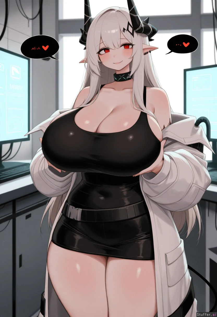 **base** absurdres, best_shading warm_lighting, best_quality, masterpiece, solo, high_resolution, high_rating **artist** RockSolidArt(artist), (usa37107692:1.2), (ohasi_art), (betterwithsalt), (pixiveo) **character** mudrock_(arknights) , mature_milf, **clothes** lab_coat, black_tank_top **settings** Smile, horny, laboratory, hands_on_breast, **body** (Tall:1.4), long_legs ((Wide_hips), (gigantic_breasts), (gigantic_ass), (gigantic_thighs), (morbidly_obese_female), (love_handls), (Fat_arms:0.85), (fat_legs), :0.5),