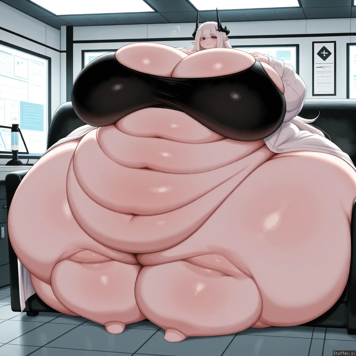 **base** absurdres, best_shading warm_lighting, best_quality, masterpiece, solo, high_resolution, high_rating **artist** RockSolidArt(artist), (usa37107692:1.2), (ohasi_art), (betterwithsalt), (pixiveo) **character** mudrock_(arknights) , mature_milf, **clothes** lab_coat, black_tank_top, **settings** Smile, horny, laboratory, hands_on_breasts, side_view, hanging_breasts, sitting_on_sofa **body** (Tall:1.4), long_legs ((Wide_hips), (gigantic_breasts), (gigantic_ass), (gigantic_thighs), (morbidly_obese_female), (love_handls), (Fat_arms:0.85), (fat_legs), :1.2),