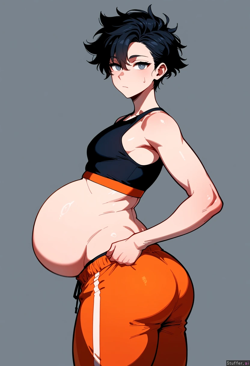 Appearance= male he has Fair skin, Gray blue eyes, black hair Short, messy hair , Slim torso, big round pregnant belly,Wide hips and thick thighs, round and plump buttocks. Black sports bra, orange sweatpants. (1flatchest adult)
