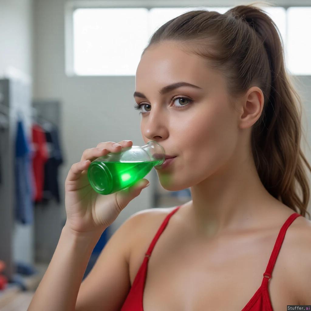 Make a closeup of The left girl drinking a small green potion.