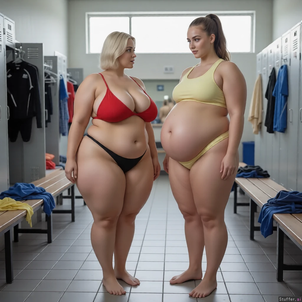 Make the right girl tall and super chunky with a hanging fat belly. The left girl is looking interested at the right girl.