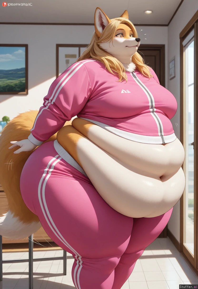 (photoRealistic), fox, furry, solo A blonde, beautiful face, long hair, (Pink Tracksuit), (((fat, belly, thick thighs, wide hips, big fat ass, weight again, (overweight)))), at home, front view, a surprised look