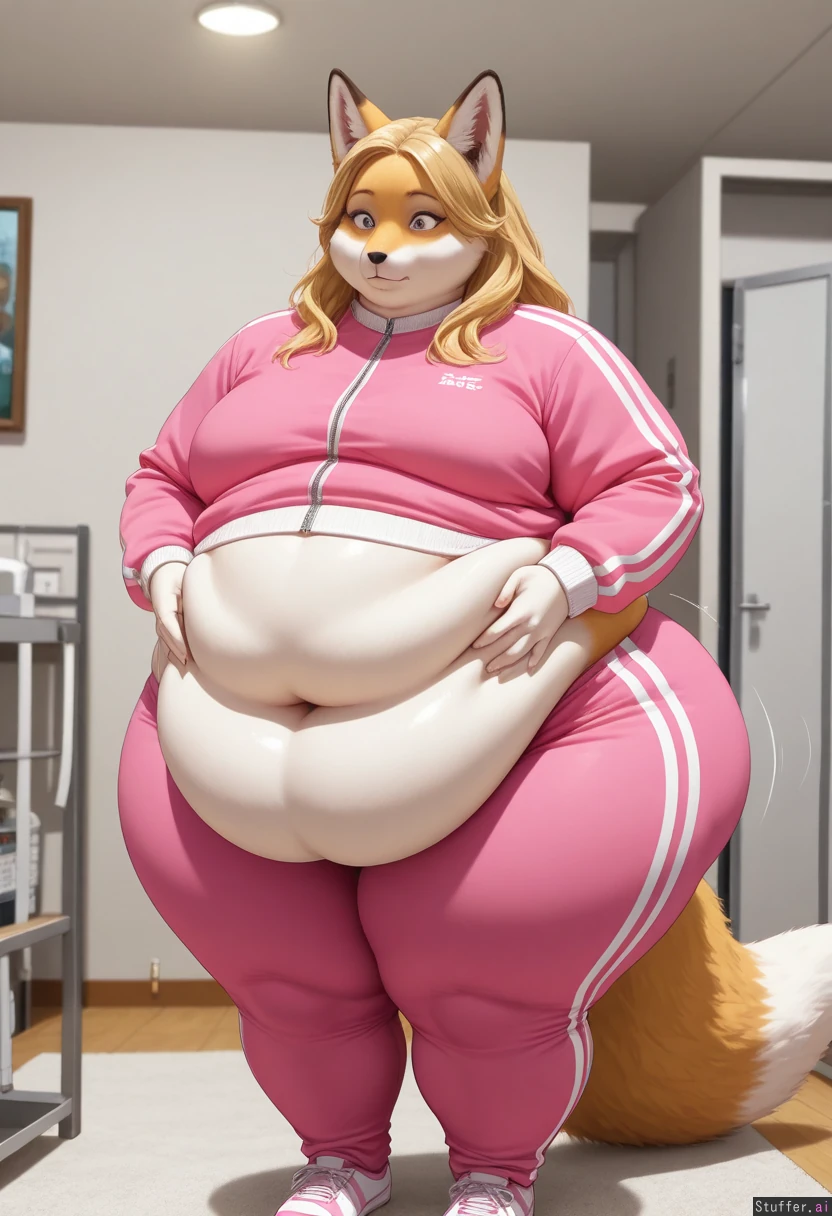 (photoRealistic), fox, furry, solo A blonde, beautiful face, long hair, (Pink Tracksuit), (((fat, belly, thick thighs, wide hips, big fat ass, weight again, (overweight)))), at home, front view, a surprised look