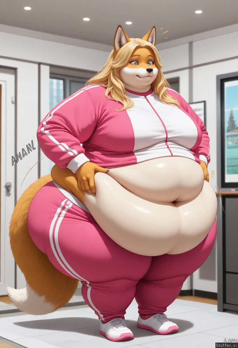 (photoRealistic), fox, furry, solo A blonde, beautiful face, long hair, (Pink Tracksuit), (((fat, belly, thick thighs, wide hips, big fat ass, weight again, (overweight)))), at home, front view, a surprised look
