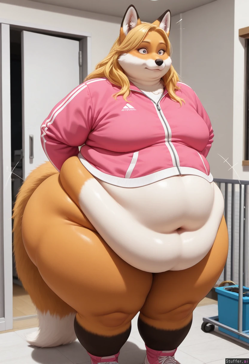 (photoRealistic), fox, furry, solo A blonde, beautiful face, long hair, (Pink Tracksuit), (((fat, belly, thick thighs, wide hips, big fat ass, weight again, (overweight)))), at home, front view, a surprised look