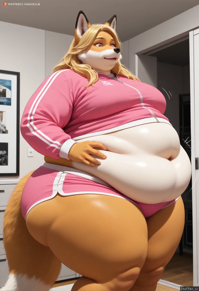 (photoRealistic), fox, furry, solo A blonde, beautiful face, long hair, (Pink Tracksuit), (((fat, belly, thick thighs, wide hips, big fat ass, weight again, (overweight)))), at home, front view, a surprised look