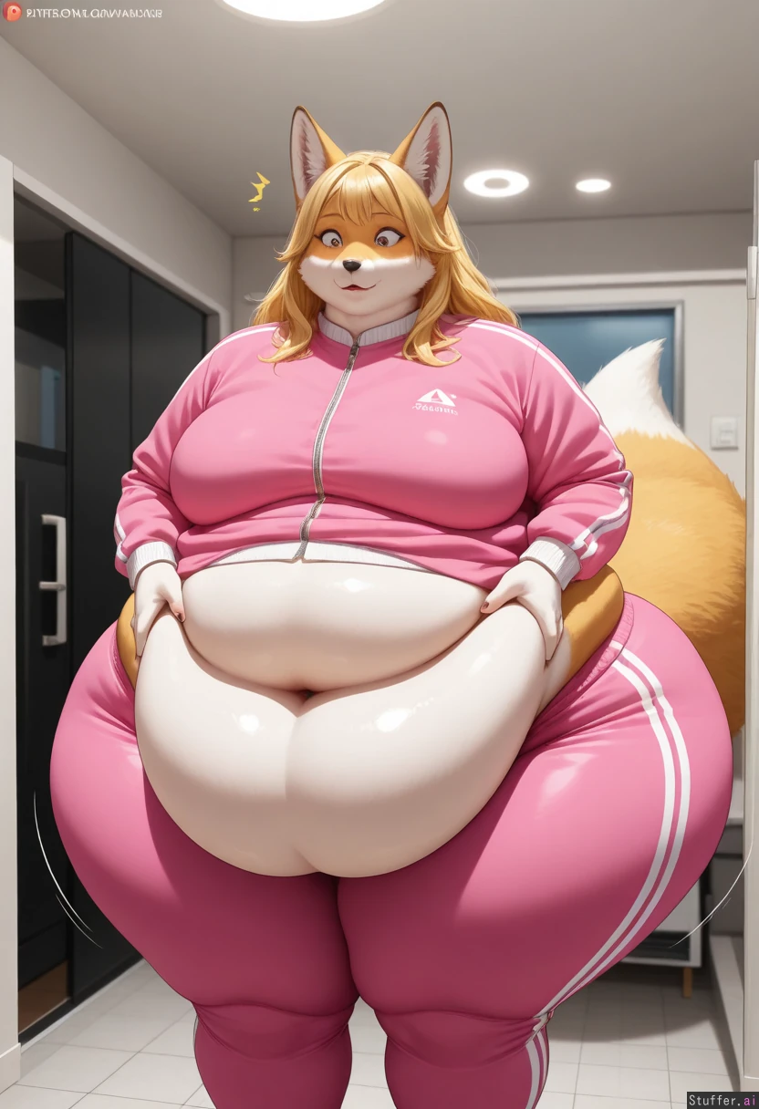 (photoRealistic), fox, furry, solo A blonde, beautiful face, long hair, (Pink Tracksuit), (((fat, belly, thick thighs, wide hips, gigantic fat ass, weight again, (overweight)))), at home, front view, a surprised look
