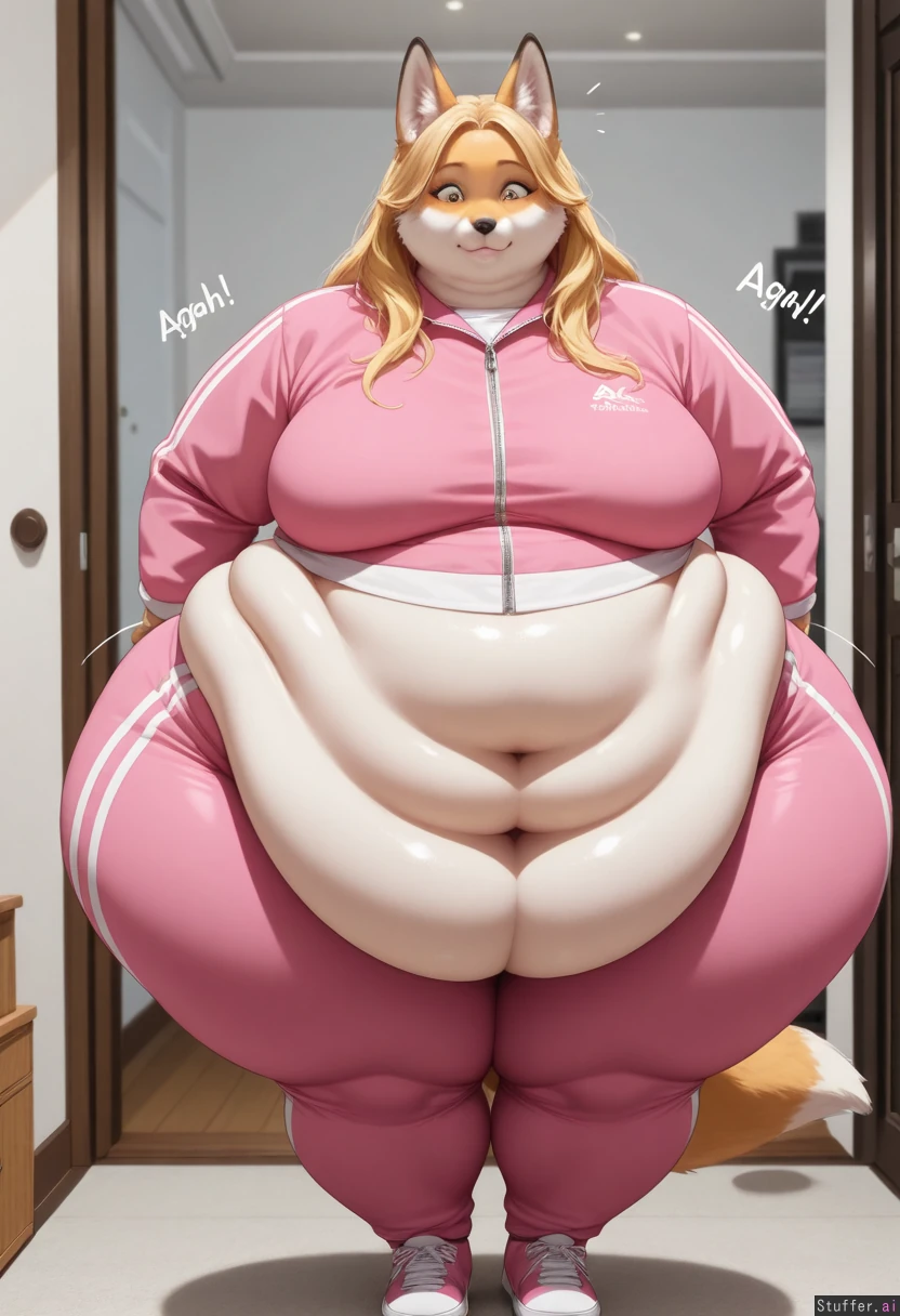 (photoRealistic), fox, furry, solo A blonde, beautiful face, long hair, (Pink Tracksuit), (((fat, belly, thick thighs, wide hips, gigantic fat ass, weight again, (overweight)))), at home, front view, a surprised look