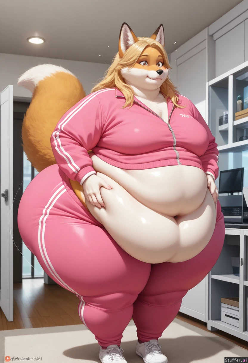 (photoRealistic), fox, furry, solo A blonde, beautiful face, long hair, (Pink Tracksuit), (((fat, belly, thick thighs, wide hips, gigantic fat ass, weight again, (overweight)))), at home, front view, a surprised look