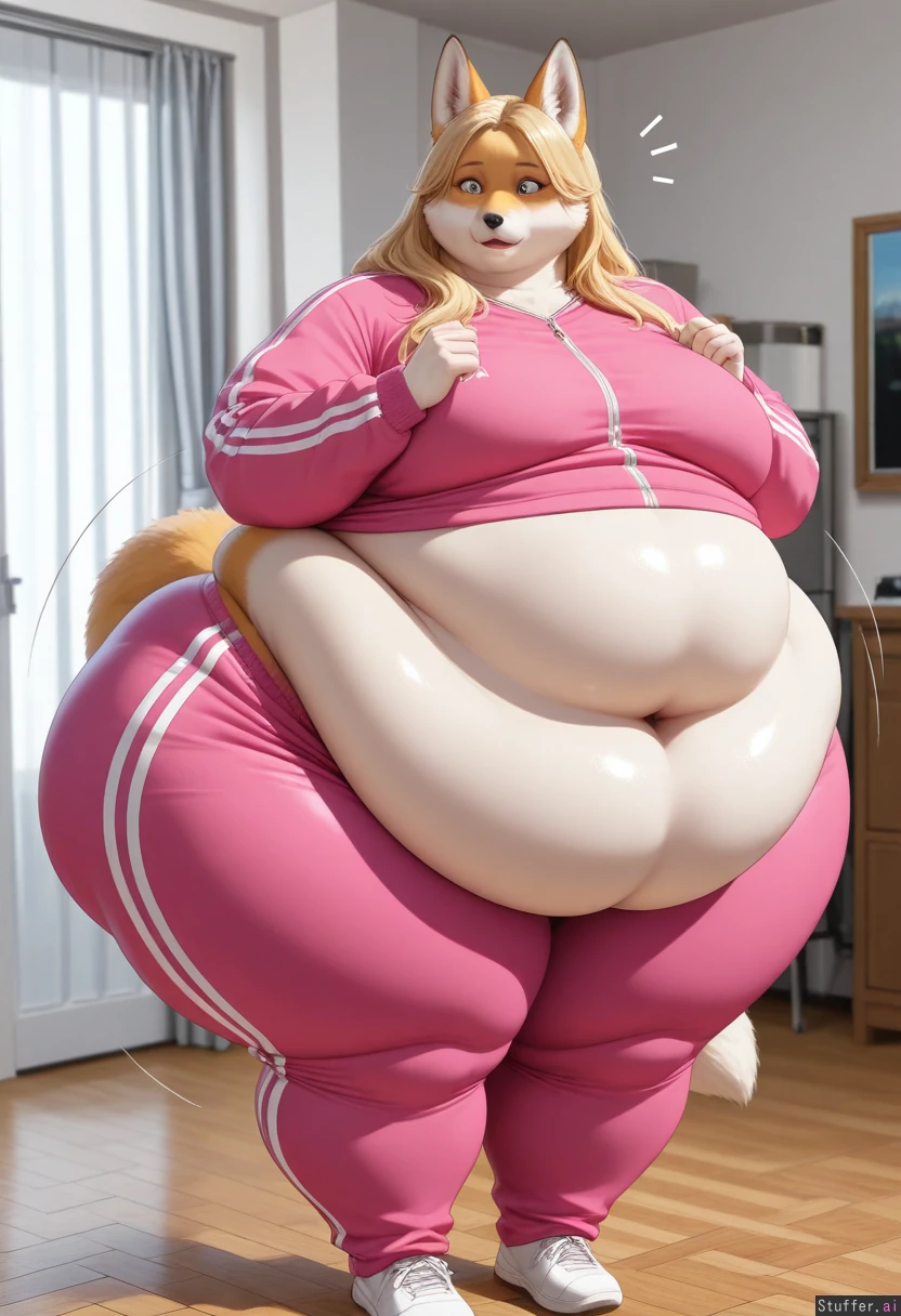 (photoRealistic), fox, furry, solo A blonde, beautiful face, long hair, (Pink Tracksuit), (((fat, belly, thick thighs, wide hips, gigantic fat ass, weight again, (overweight)))), at home, front view, a surprised look