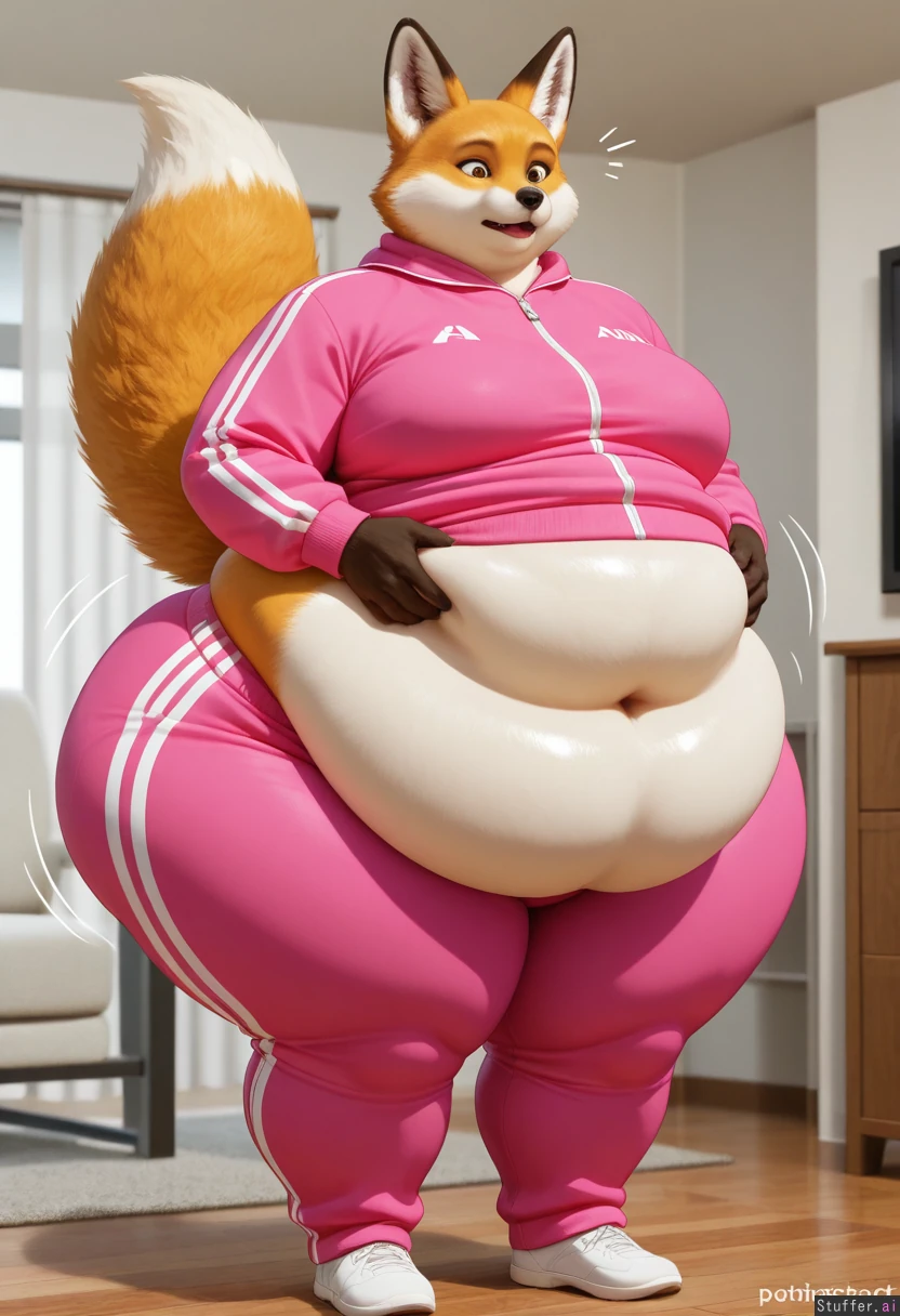 (photoRealistic), fox, furry, solo (Pink Tracksuit), (((fat, belly, thick thighs, wide hips, gigantic fat ass, weight again, (overweight)))), at home, front view, a surprised look